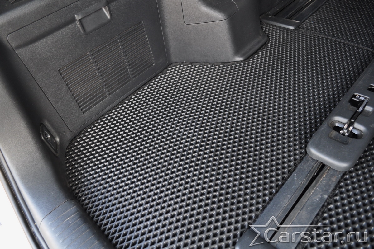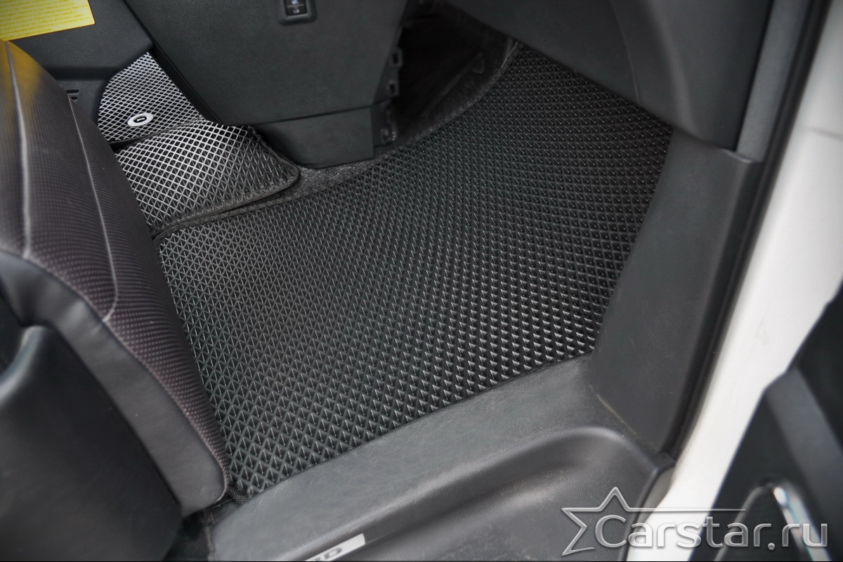 Толщина ковриков EVA составляет 10-12 мм. Глубина ячеек 7-8 мм. Такая толщина ковриков позволяет им служить довольно долго, не протираясь до 3 лет. А благодаря такой глубине ячеек коврик EVA площадью 1 кв.м. способен захватить около 3,5 л жидкости, сохраняя в чистоте вашу обувь и обивку салона.