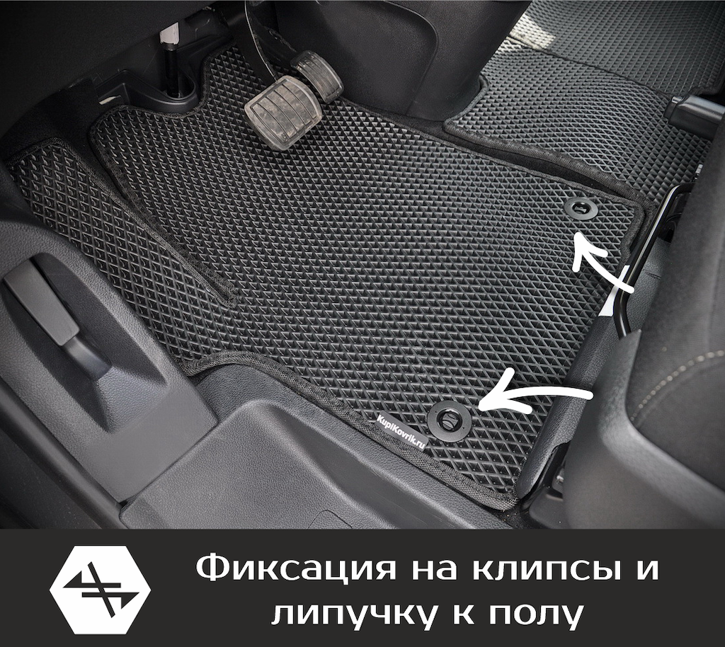 Обратная сторона резиновой основы покрыта шипами противоскольжения. Также присутствуют оригинальные клипсы крепления коврика к полу. Если в полу предусмотрены крючки, то в коврике устанавливаются ответные люверсы. Коврик надёжно держится на месте, не ёрзает, не попадает под педали, не создаёт аварийных ситуаций.